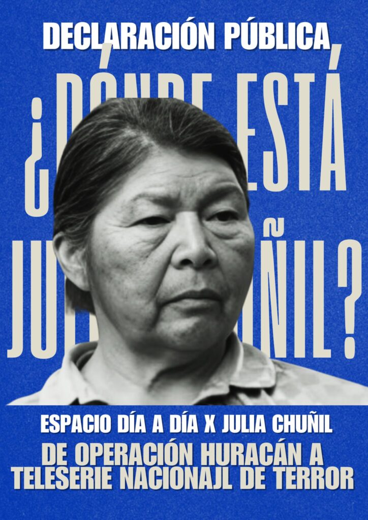 La articulación “Día a Día por Julia Chuñil”, es un espacio horizontal, diverso, nacional e internacional, creado en diciembre de 2024 para visibilizar su desaparición. Desde uno de sus grupos de trabajo, se solicitó adhesiones a las organizaciones y a las personas que comparten la necesidad de asumir una posición clara frente a los últimos hechos relacionados con la desaparición de Julia Chuñil y la formalización de miembros de su familia.