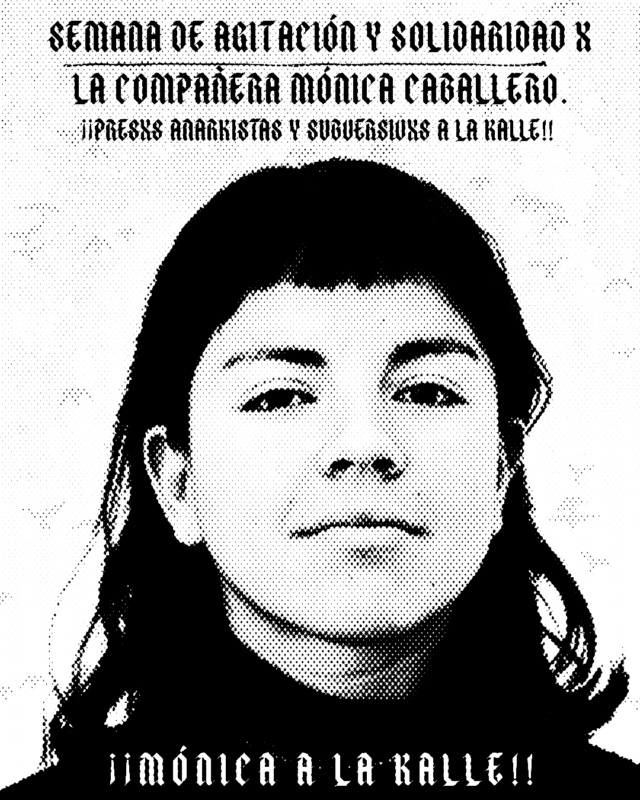 [13] Mónica Caballero Sepúlveda entre 2010 y 2012 fue perseguida junto a otros anarquistas, entre ellos Francisco Solar, por actos terroristas supuestamente cometidos entre 2006 y 2008. El caso fue nombrado por los medios de comunicación del Estado $hileno “Caso Bombas”. Fue un chasco ya que no había pruebas y fueron todos absueltos en junio de 2012. En 2013 Mónica es detenida junto a Francisco Solar en España, siendo imputada por colocación de artefacto explosivo en la Basílica Nuestra Señora del Pilar, en Zaragoza. Cumple 3 años de prisión preventiva y es condenada (tal como Francisco Solar) a 12 años, los que son rebajados a 4, a cambio de la expulsión permanente de España. Desde 2017 continúa su participación anarquista en Chile. El 24 de julio de 2020 es detenida junto a F. Solar, en el marco de un “caso bombas II”, por ataques explosivos en Santiago, incluyendo la comisaría de la cual habían salido varias décadas antes los asesinos de los hermanos Vergara (29 de marzo de 1985), edificios de trasnacionales en sectores altos de la capital y encomiendas explosivas al ex ministro de interior Rodrigo Hinzpeter, quien los había perseguido sin pruebas en el Gobierno de Piñera I. En marzo 2023 las audiencias para condenar a Mónica Caballero y Francisco Solar, modificaron su calidad de autora a la de cómplice y varios otros cargos se caen, y finalmente de 30 años su condena queda en 12. Mónica Caballero reivindica la “violencia política y el daño a las representaciones simbólicas, estructuras materiales y personas, que sostienen la dominación del sistema de opresión capitalista y heteropatriarcal”. Desde abril de 2026, se informa en medios anarquistas, que la Corte de Apelaciones revisará por segunda vez su postulación a la libertad condicional ya que cumple con todos los requisitos exigidos para obtener este “beneficio” legal. (El Porteño, 14/03/2023, La Peste, Agosto Negro 2025, Prensa de Tribunales 08/11/2023; Informativo anarquista 8/11/ y 29/08/2024, y recientemente 24/03/2026).